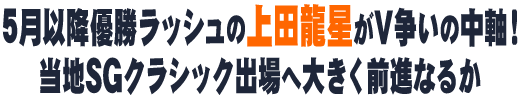上田龍星が主役を担う。2026年前期適用勝率はメンバー中トップの7.36をマーク。さらに8優出5V。その中には11月に行われた浜名湖GⅠ周年での優出(2着)もあり、リズムの良さは1歩も2歩も抜きんでた存在と言っていい。最大の魅力は正確無比なコーナー戦。コースを問わずに狙ったところへピンポイントにボートを送り込む。当地は約5年ぶりの参戦となった今年7月に行われた「にっぽん未来プロジェクト競走in蒲郡」をオール3連対で優勝するなど、水面相性はバッチリ。今回を勝てば今年7度目のV。来年3月に当地で行われるSGボートレースクラシック出場への可能性が大きく膨らむこともあり、スピード全開でVロードを突っ走る。