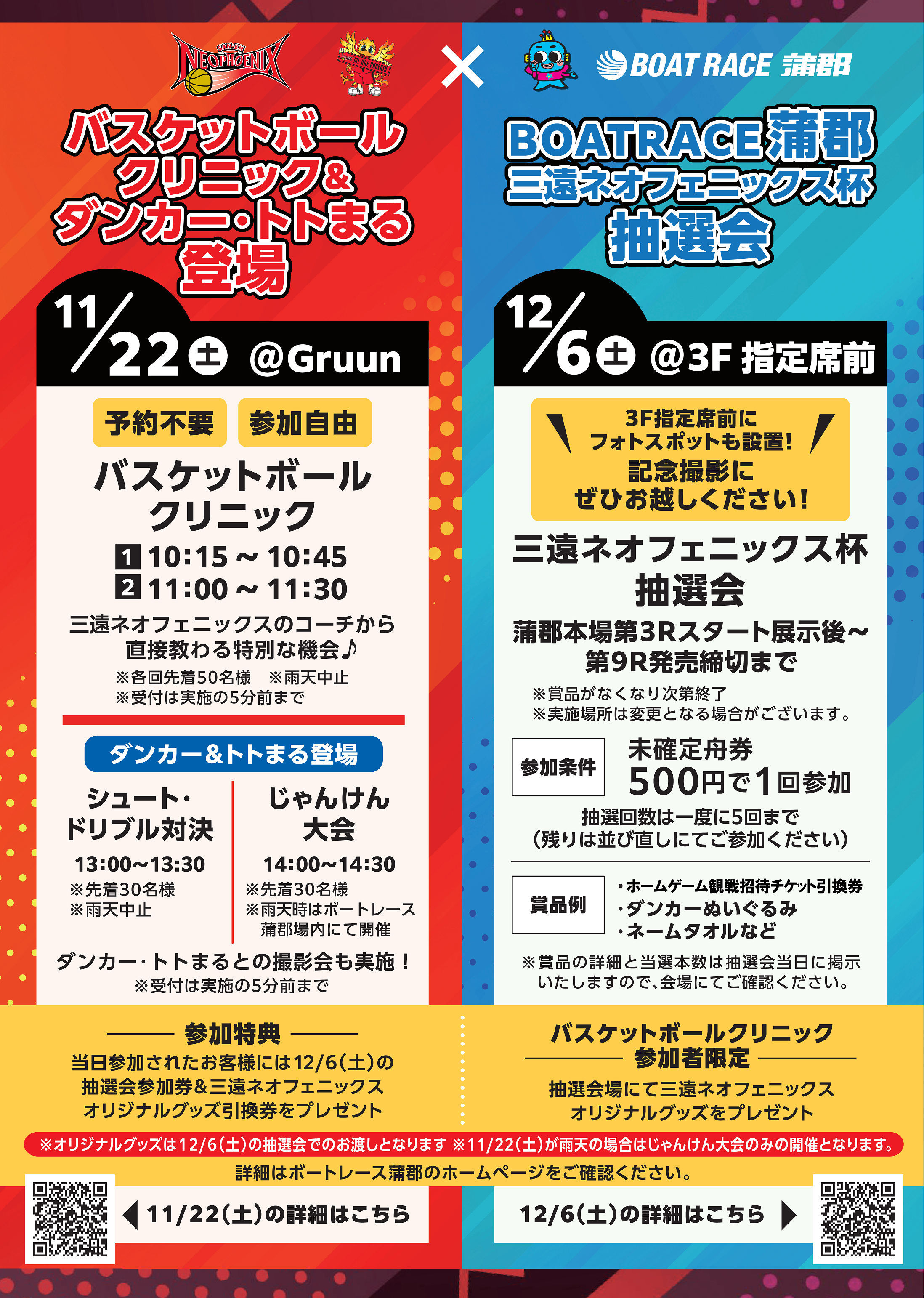 当日クリニックに参加されたお客様には、12/6(土)にボートレース蒲郡で行われる三遠ネオフェニックス杯抽選会参加券と、フェニックスオリジナルグッズグッズ引換券をプレゼントします。