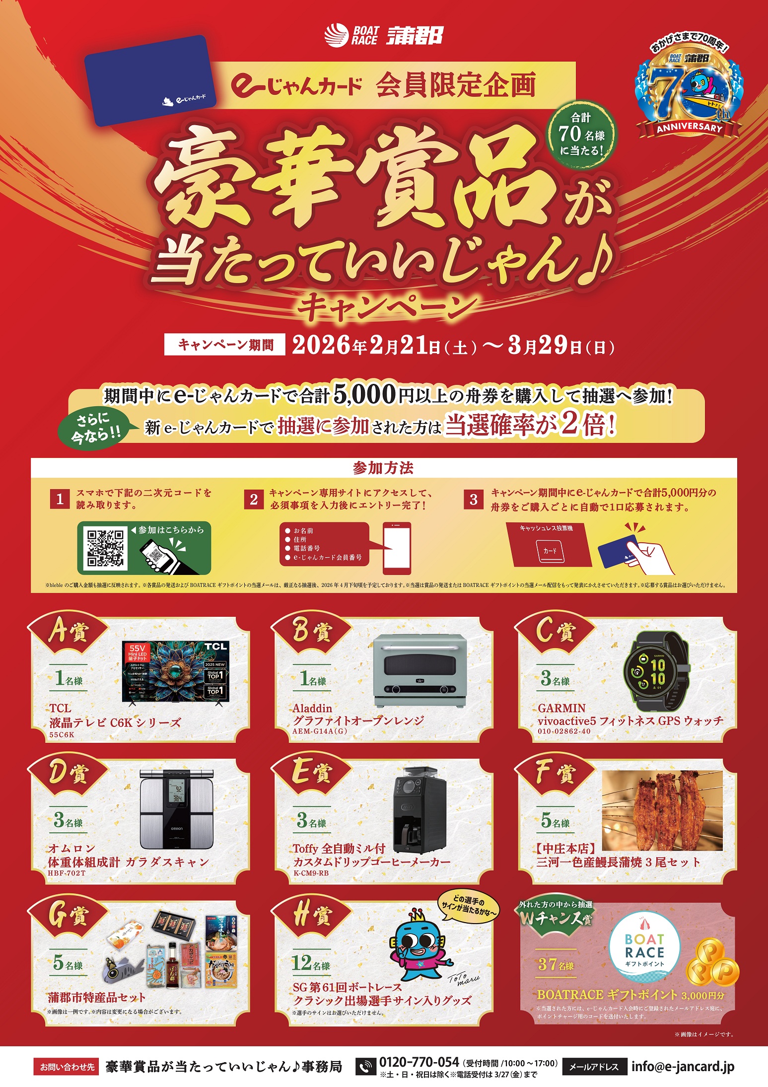 e-じゃんカードで舟券を購入いただいた方に抽選で賞品が当たるキャンペーンを実施中です。