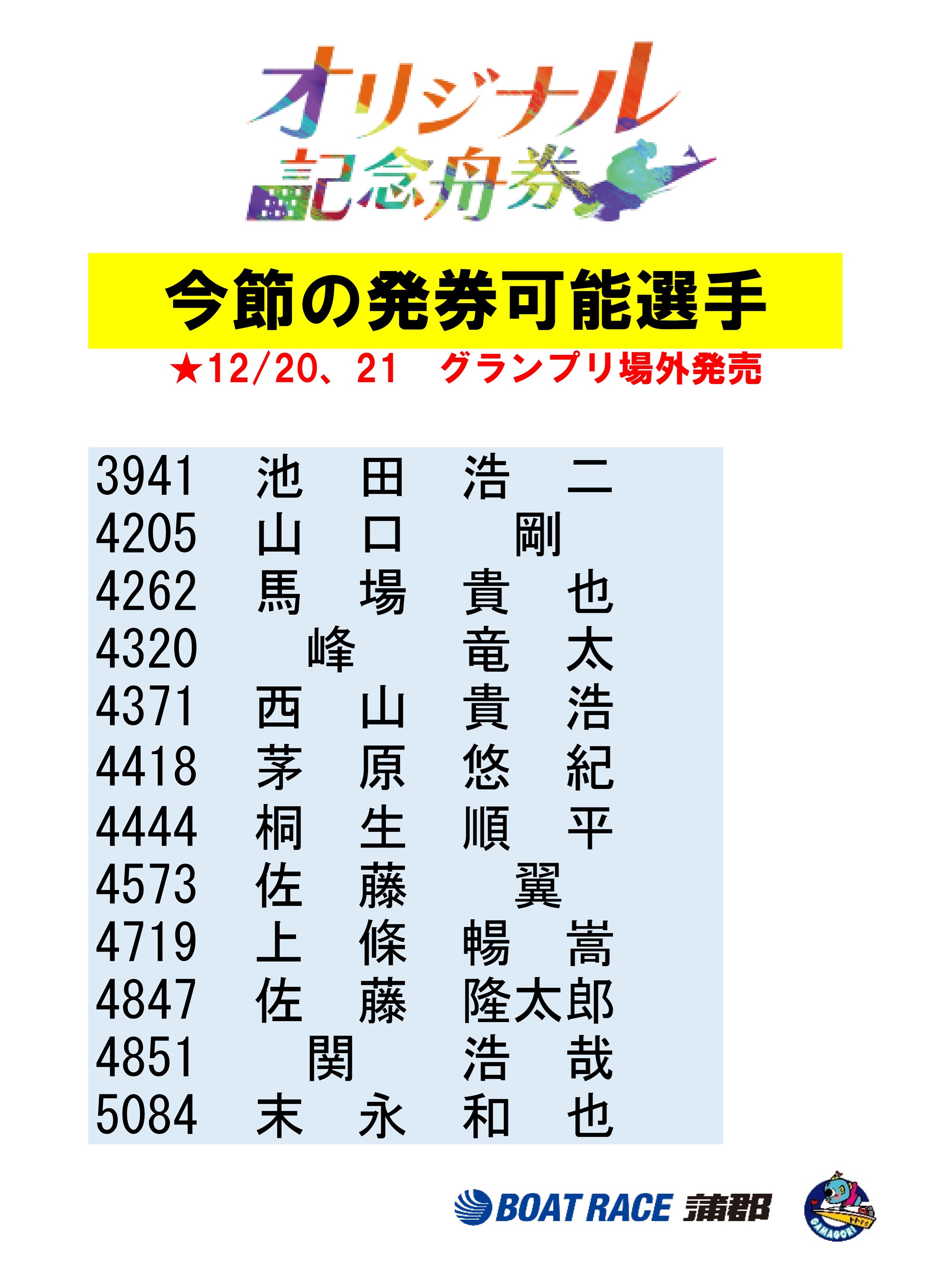 蒲郡本場のオリジナル記念舟券発行機が臨時稼働!トライアル2ndに出場する選手12名のオリジナル記念舟券が発行可能です。