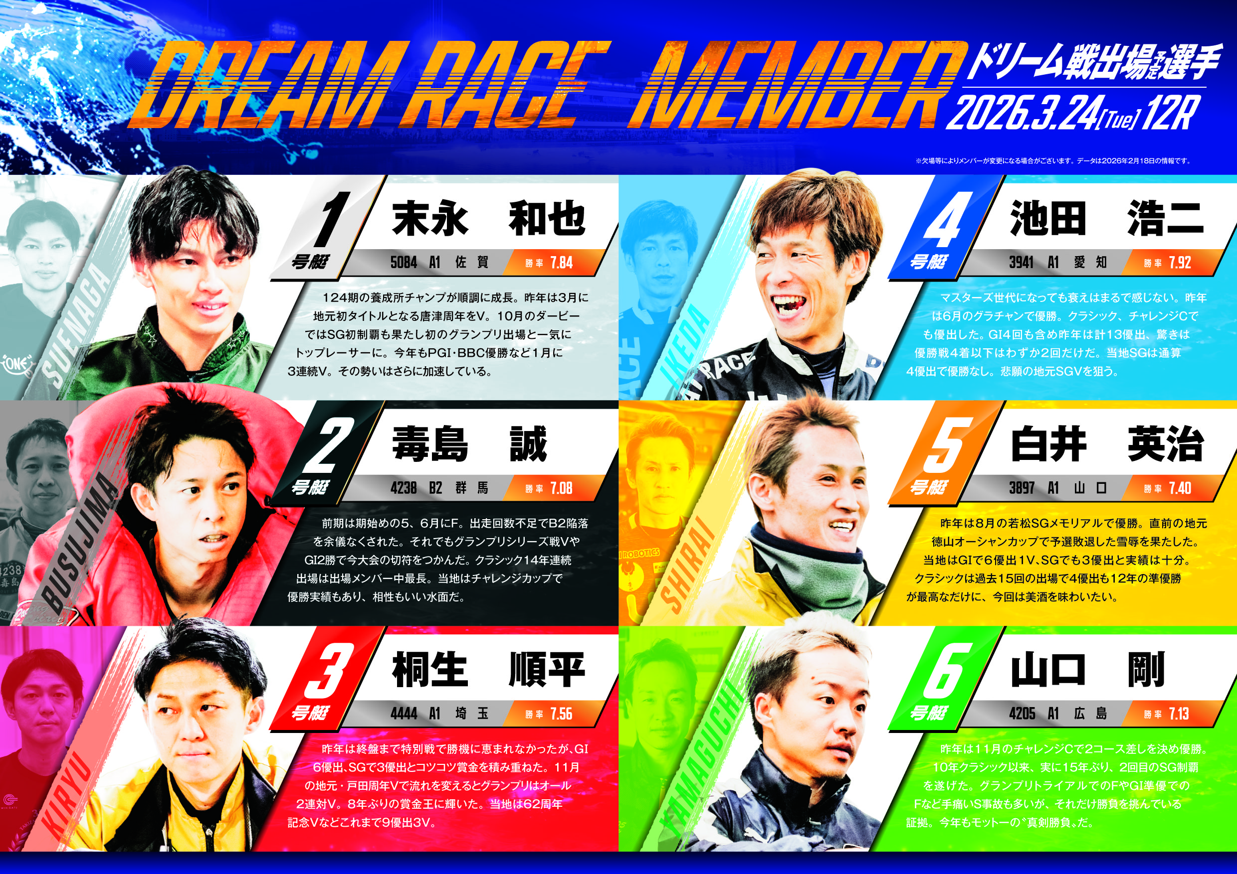 3月24日(火)~3月29日(日)で開催される「SG第61回ボートレースクラシック」の初日第12Rに実施するドリーム戦の出場選手及び枠番が決定いたしました!